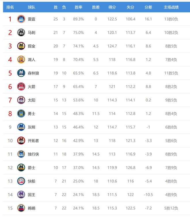 今日比賽后火箭、森林狼排名互換,國王、鵜鶘排名互換,其他西部球隊排名不變。
